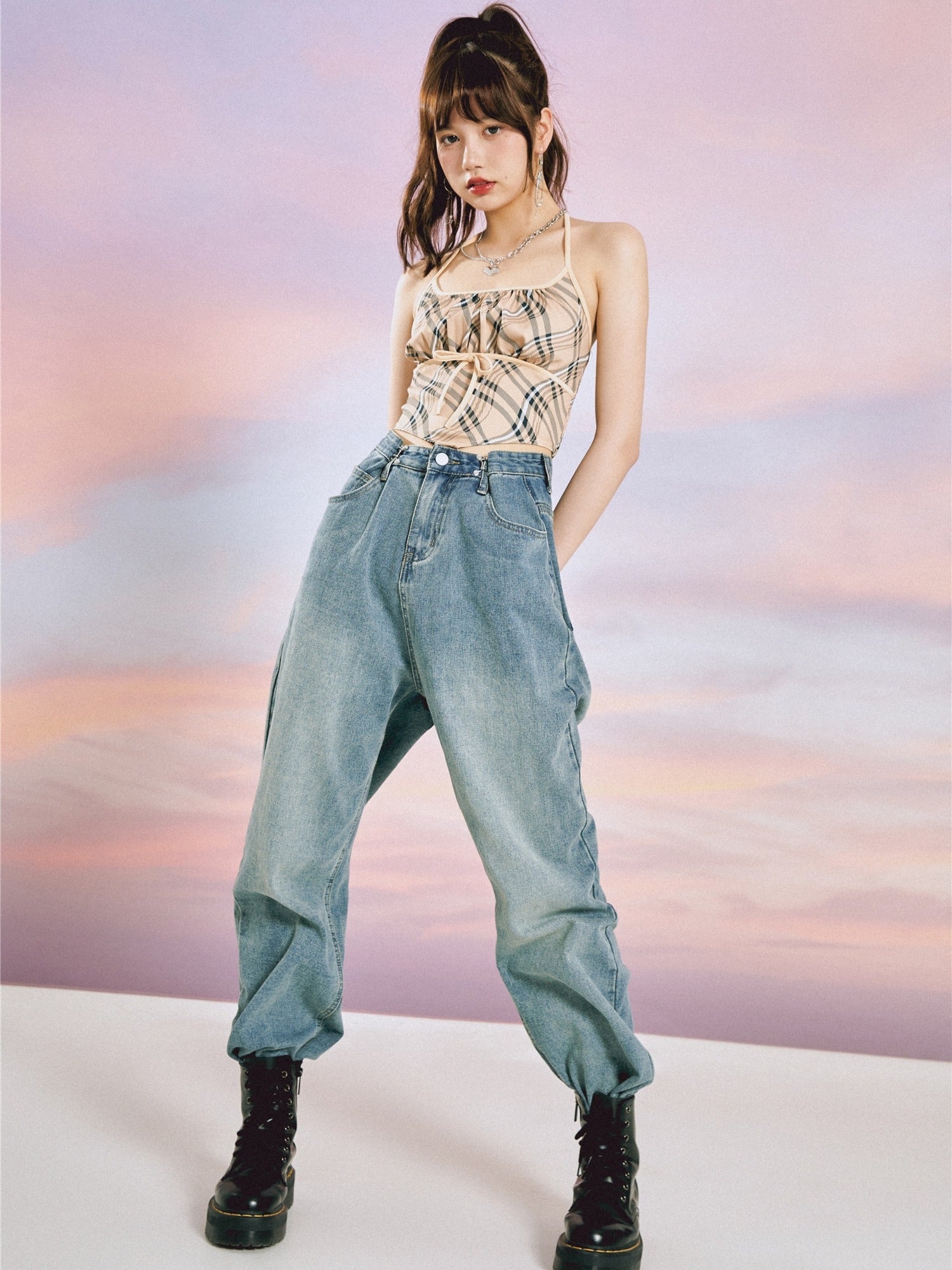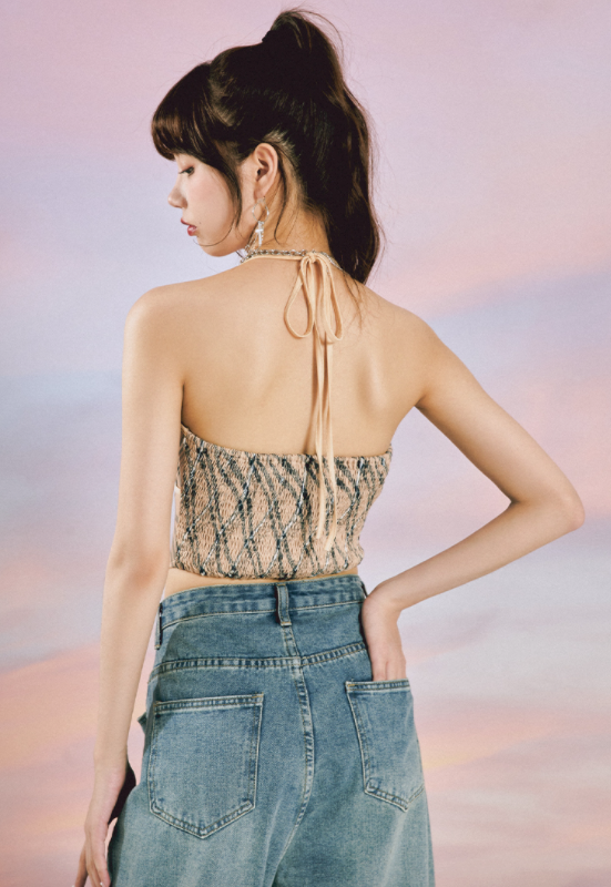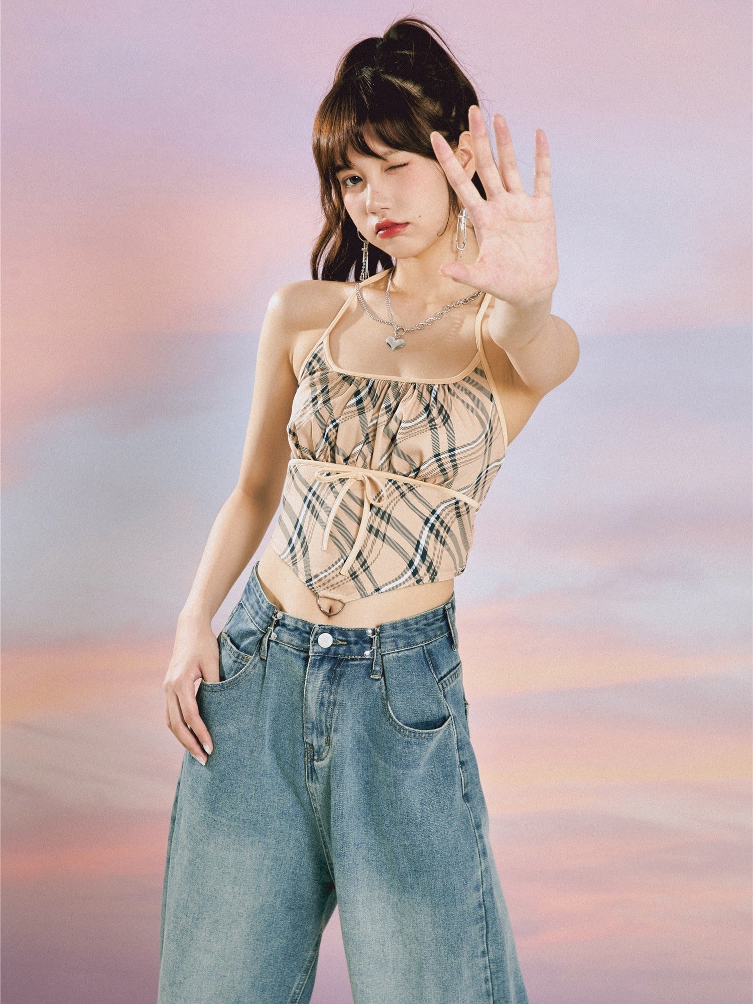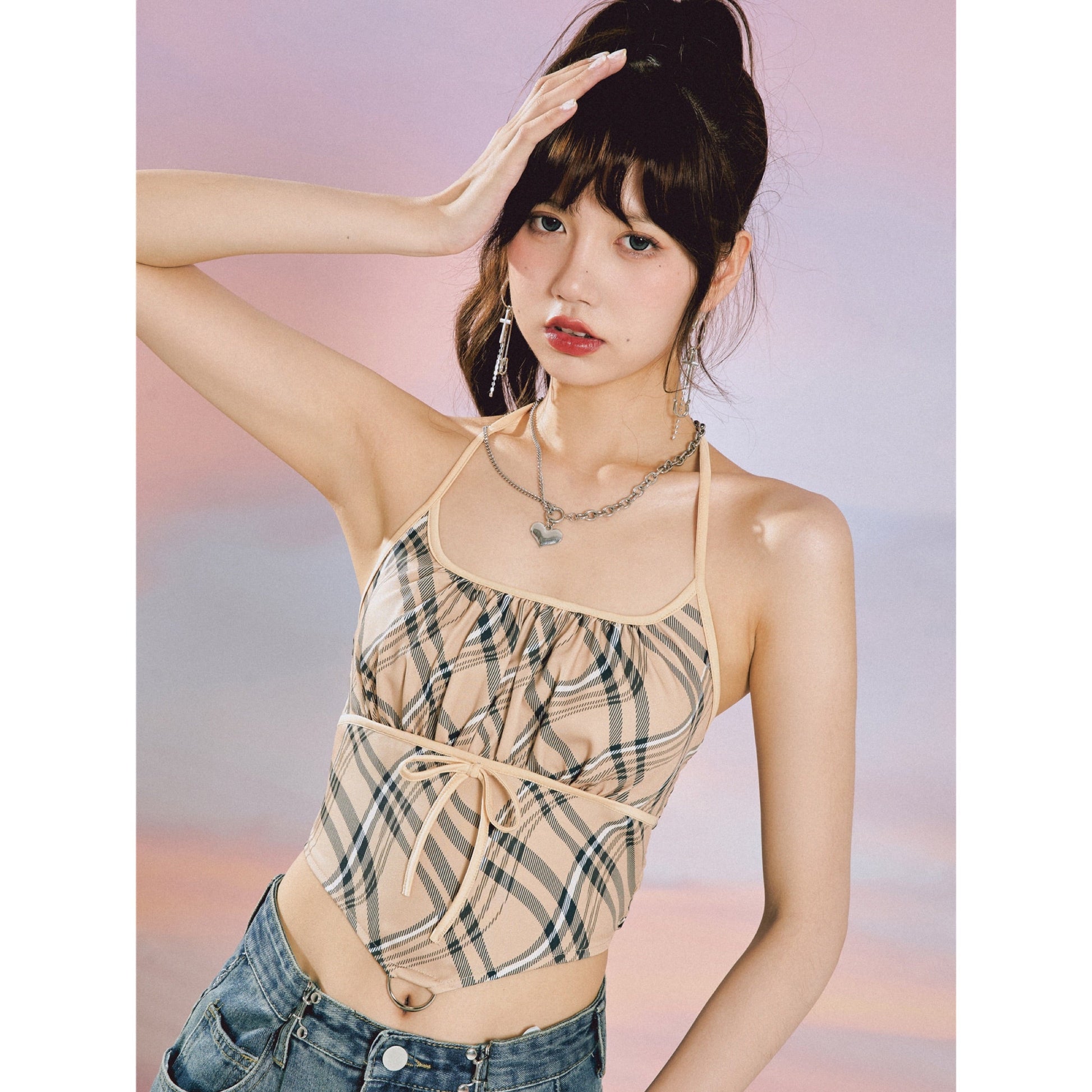 Y2K Khaki Plaid Halter Sling ~ HANDMADE